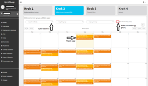 7. Wybieramy w kalendarzu spośród dostępnych opcji zajęcia na których chcemy odrobić nieobecność. Można też przefiltrować je sobie na górze pod względem dzielnicy oraz grupy. Grupy w których przekroczony został limit miejsc na konkretne zajęcia nie są wyświetlane.